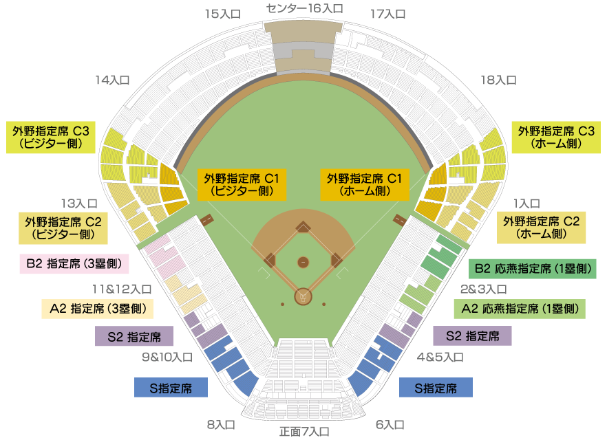 S指定席5,400円S2指定席4,800円A2応燕指定席(1塁側)4,100円A2指定席(3塁側)4,100円B2応燕指定席(1塁側)3,600円B2指定席(3塁側)3,600円外野指定席C1(大人)3,400円外野指定席C1(子供)1,300円外野指定席C2(大人)3,100円外野指定席C2(子供)1,300円外野指定席C3(大人)2,300円外野指定席C3(子供)1,100円