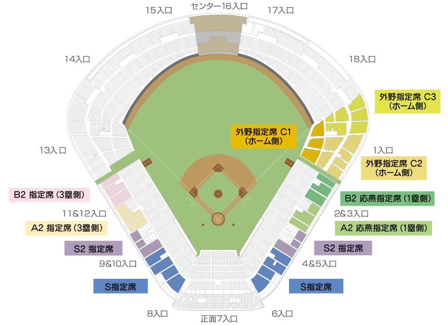 S指定席4,200円S2指定席3,700円A2応燕指定席(1塁側)3,200円A2指定席(3塁側)3,200円B2応燕指定席(1塁側)2,700円B2指定席(3塁側)2,700円外野指定席C1(ホーム側)2,500円外野指定席C2(ホーム側)2,200円外野指定席C3(ホーム側)1,400円