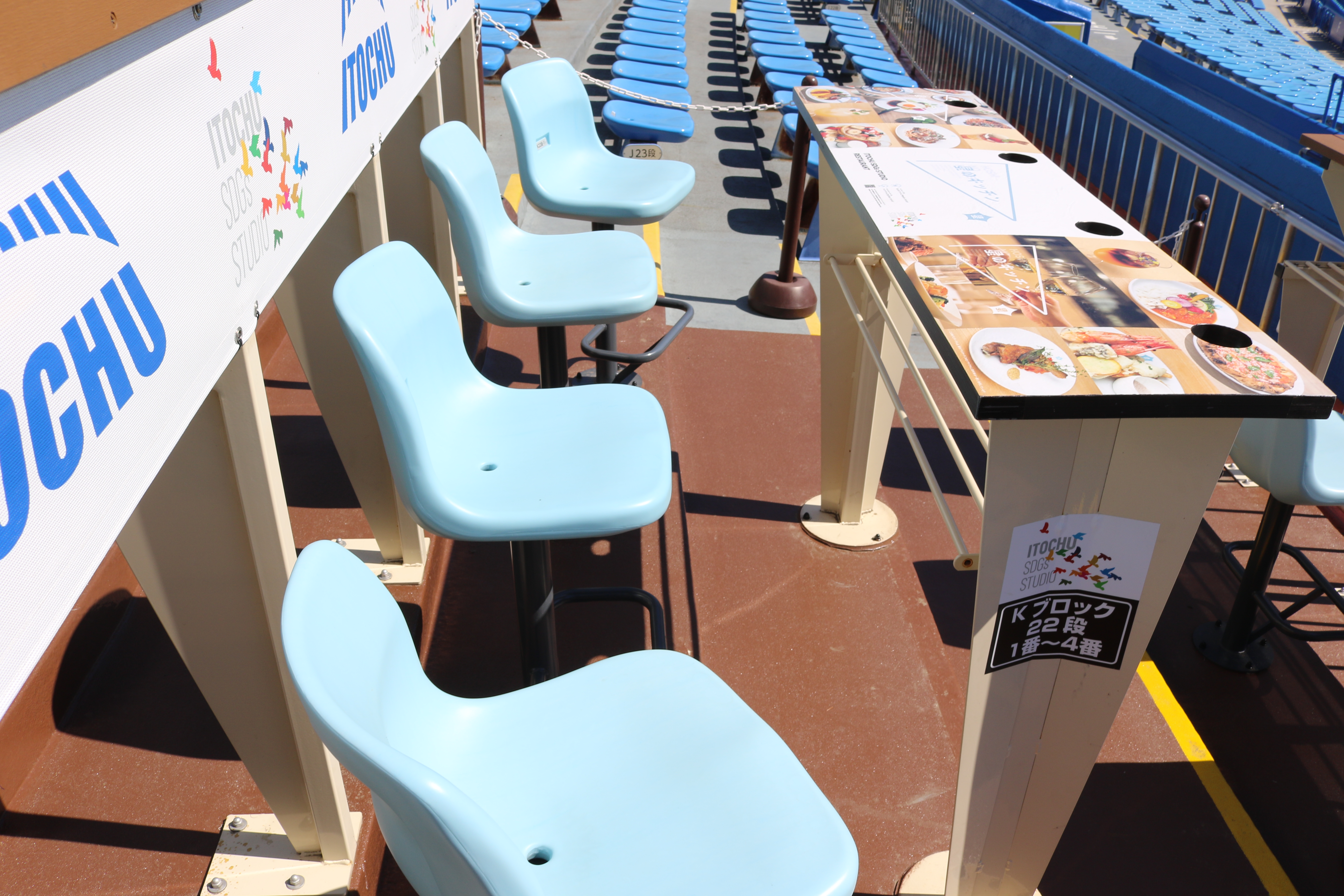 外野スタンドから球場全体を見渡す事ができる、ハイカウンターとハイチェアーを採用