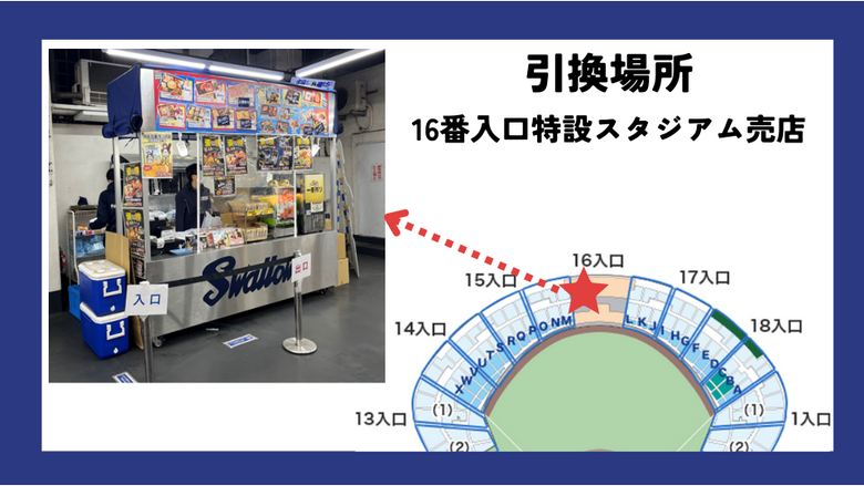 試合当日のチケットをお持ちの上、16入口付近「特設スタジアム売店」にお越しください。