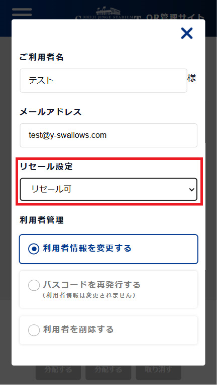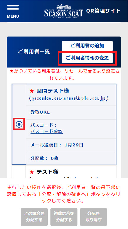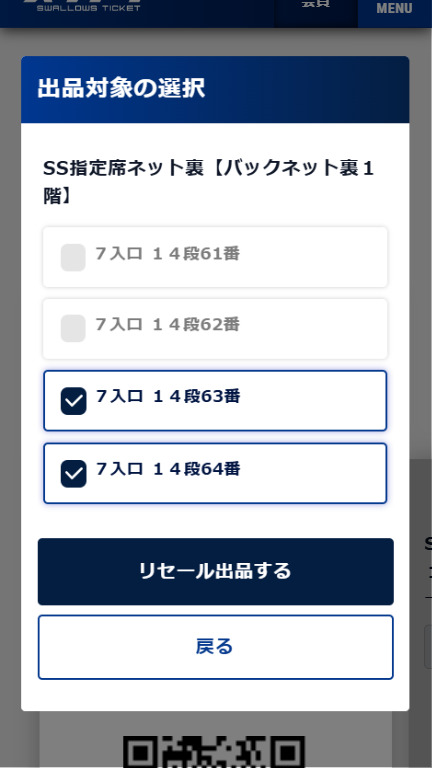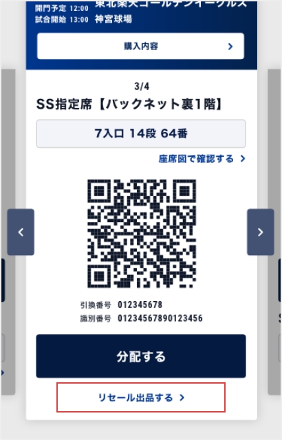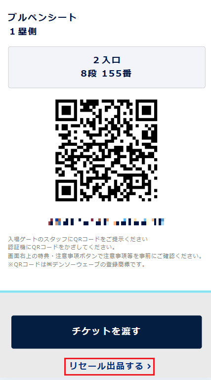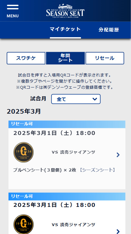 - 年間シートオーナー様から分配されたQRチケット(分配時にオーナー様がリセールを許可した場合のみ)