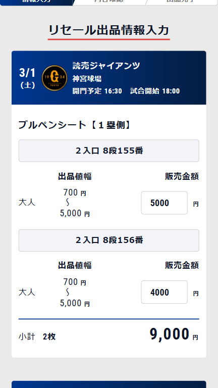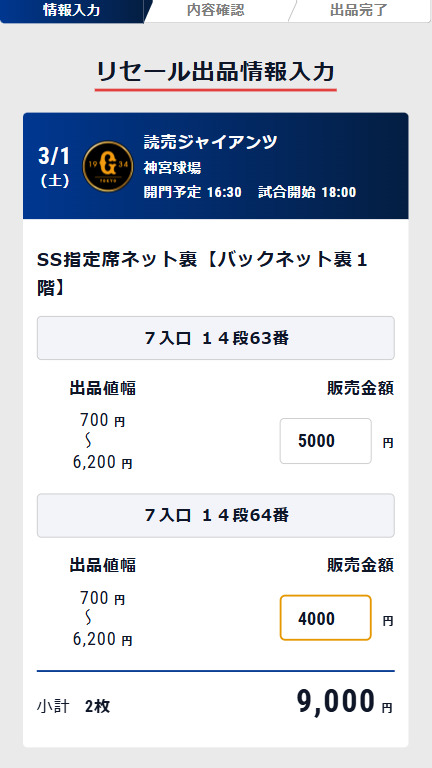 契約席種ごとに出品価格の上限がございます。通路側等、座席位置によって上限金額は異なります。700円~上限価格の範囲で、出品者が出品金額を設定できます。