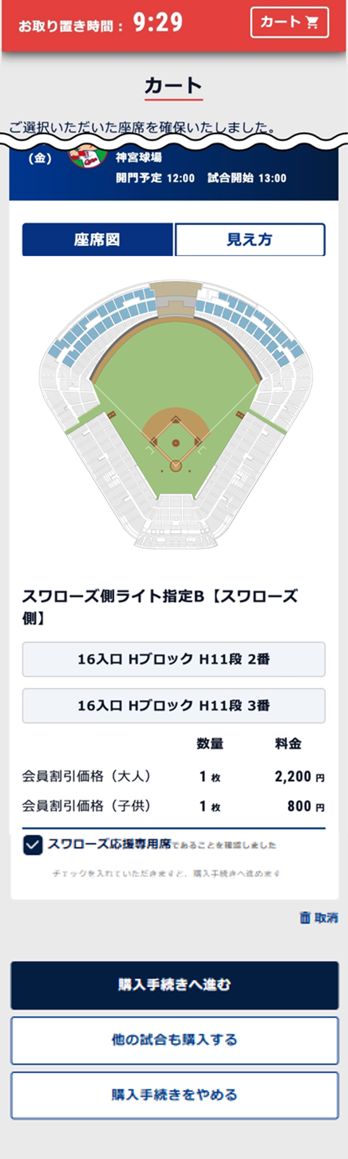 スワローズ応援専用席またはビジター応援専用席のお席を選択した場合、「スワローズ応援専用席」または「ビジター応援専用席」であることを確認する項目にご同意のチェックを入れてください。