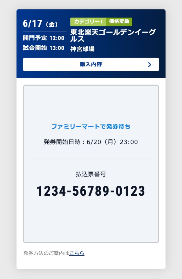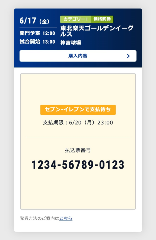 - セブン-イレブン発券もしくはファミリーマート発券の場合、払込票番号が発行されます。払込票番号は購入履歴からも確認できます。