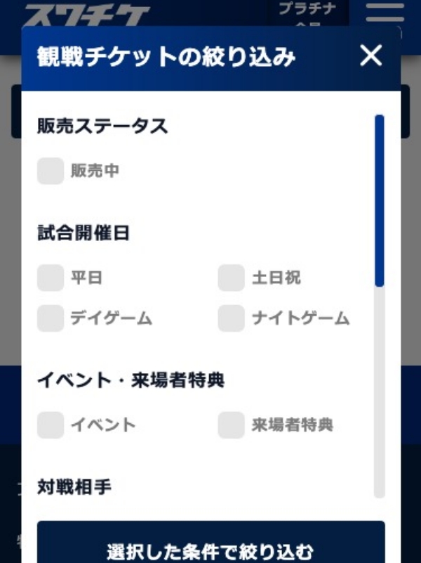 観戦チケットの絞り込み機能について