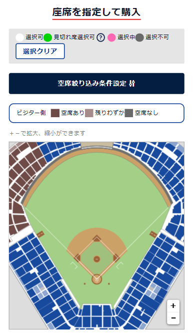 - ピンチアウト(または+-ボタン押下)で球場MAPが拡大・縮小できます。