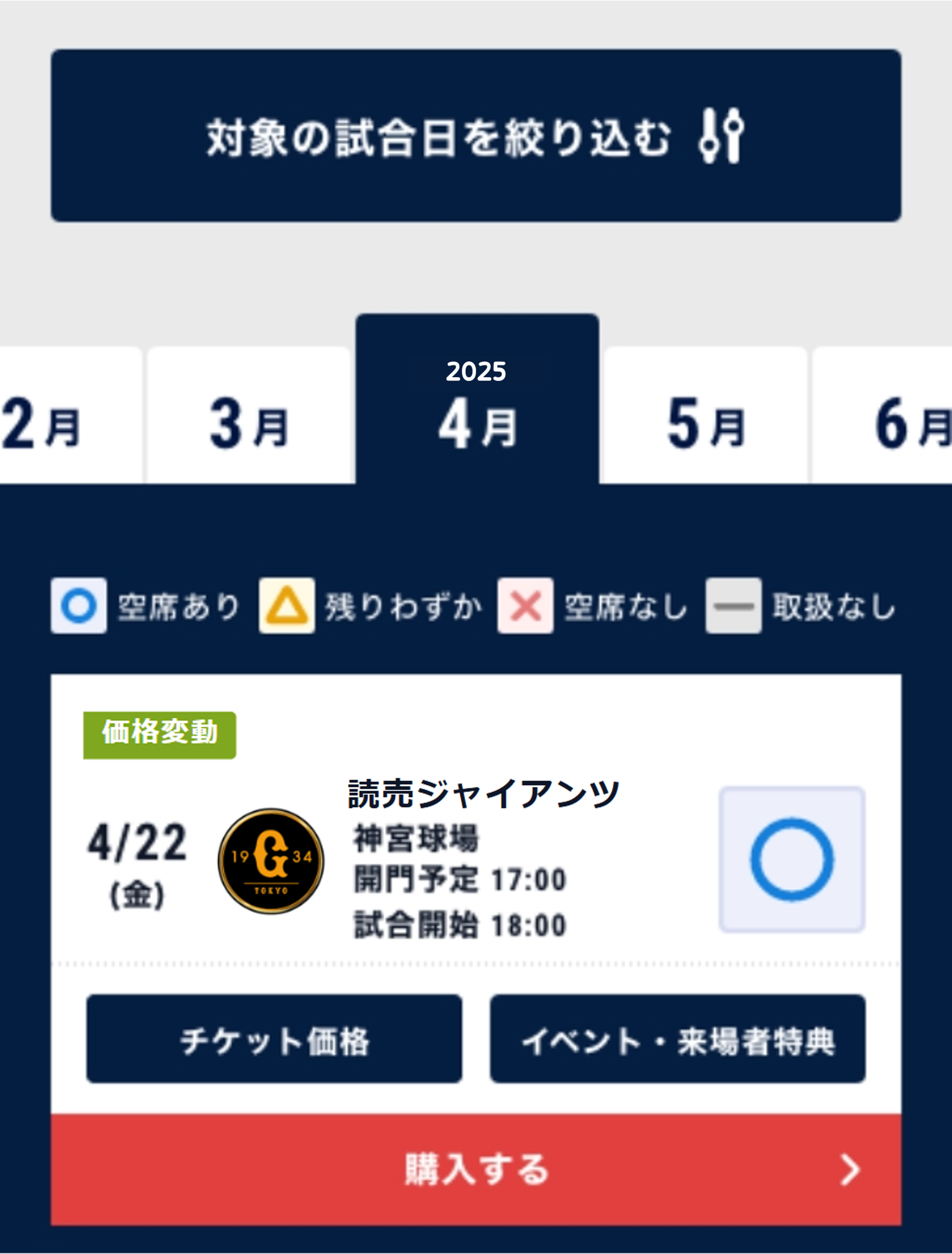 ご希望の観戦チケット(試合日)を、以下の条件で絞り込んで簡単に検索することができます。