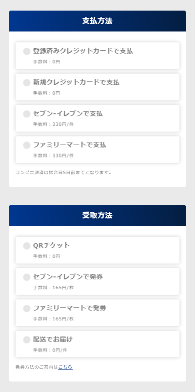 チケットの販売方法や種類、試合日までの日数などによって、支払・受取方法は限定される場合があります。