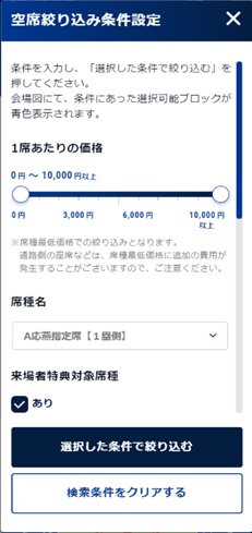 上限下限価格の設定を行い、その価格が含まれる席種を絞り込み